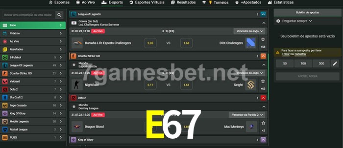 O E67 oferece uma grande seleção de opções de apostas em e-sports com probabilidades competitivas